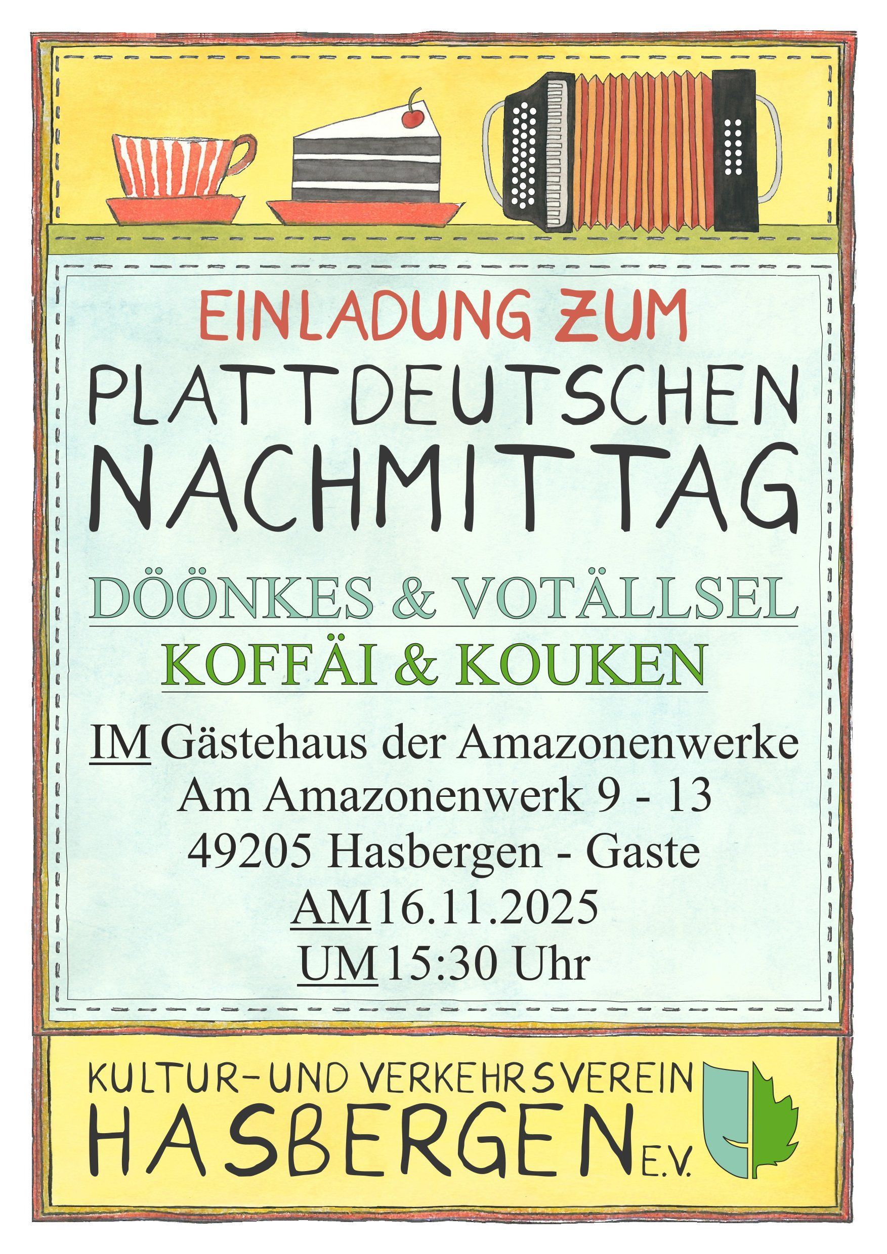 Wir freuen uns, dass Sie den Weg auf unsere Seite gefunden haben. Hier im Kultur- und Verkehrsverein Hasbergen e.V. kümmern wir uns um die Kultur in unserem schönen Ort Hasbergen. Seit seiner Gründung 1982 hat der Verein es sich zur Aufgabe gemacht nicht nur kulturelle Ereignisse zu fördern und zu organisieren, er setzt sich auch tatkräftig für den Denkmalschutz in Hasbergen ein. Mehr zur Vereinsgeschichte sowie unseren Werten und Aufgaben finden Sie hier >>